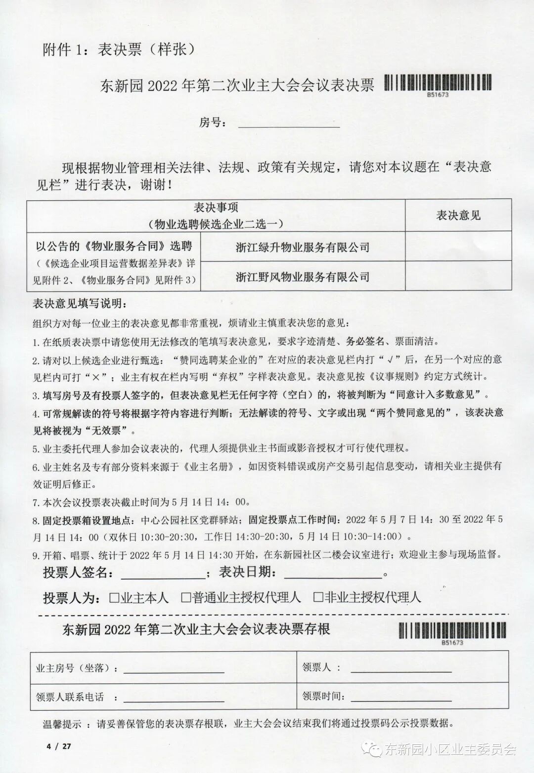 东新园2022年第二次业主大会会议表决票(样票)